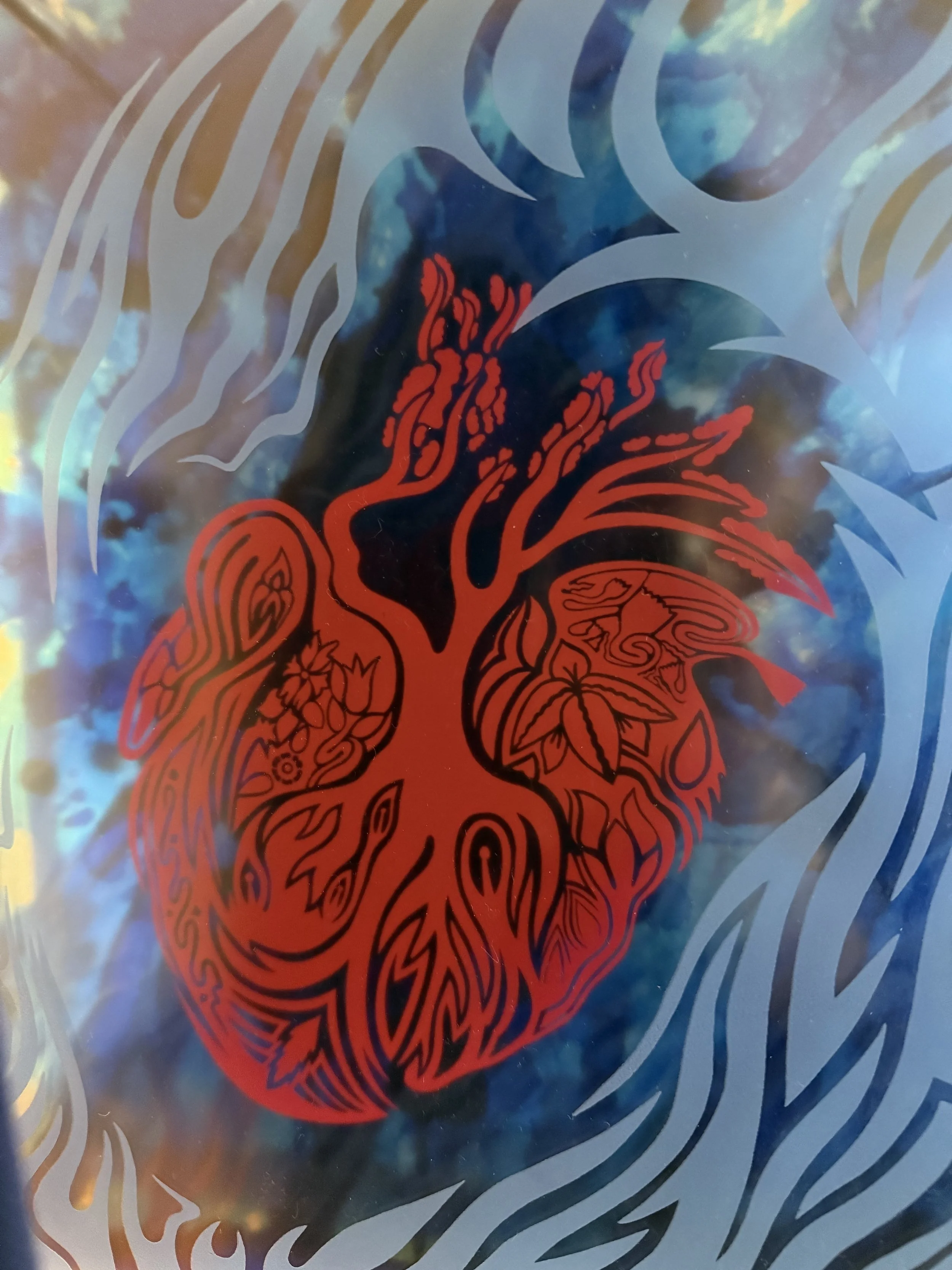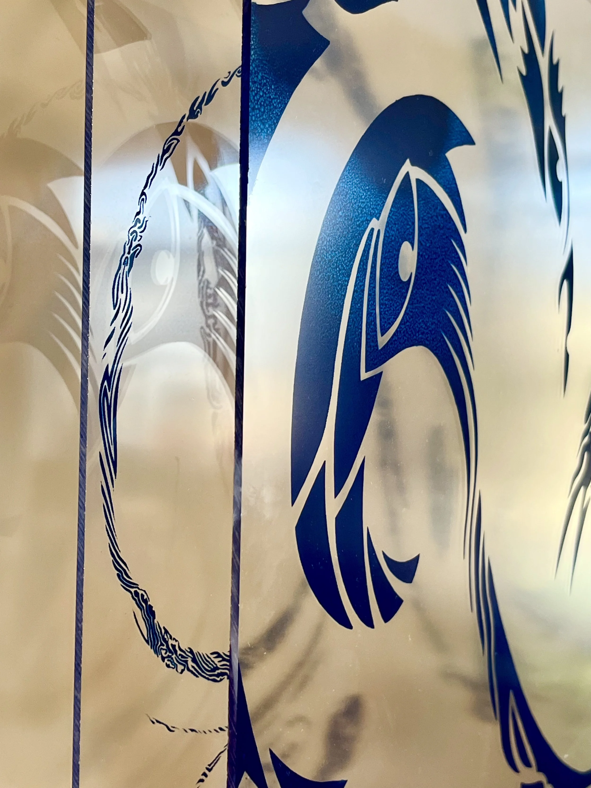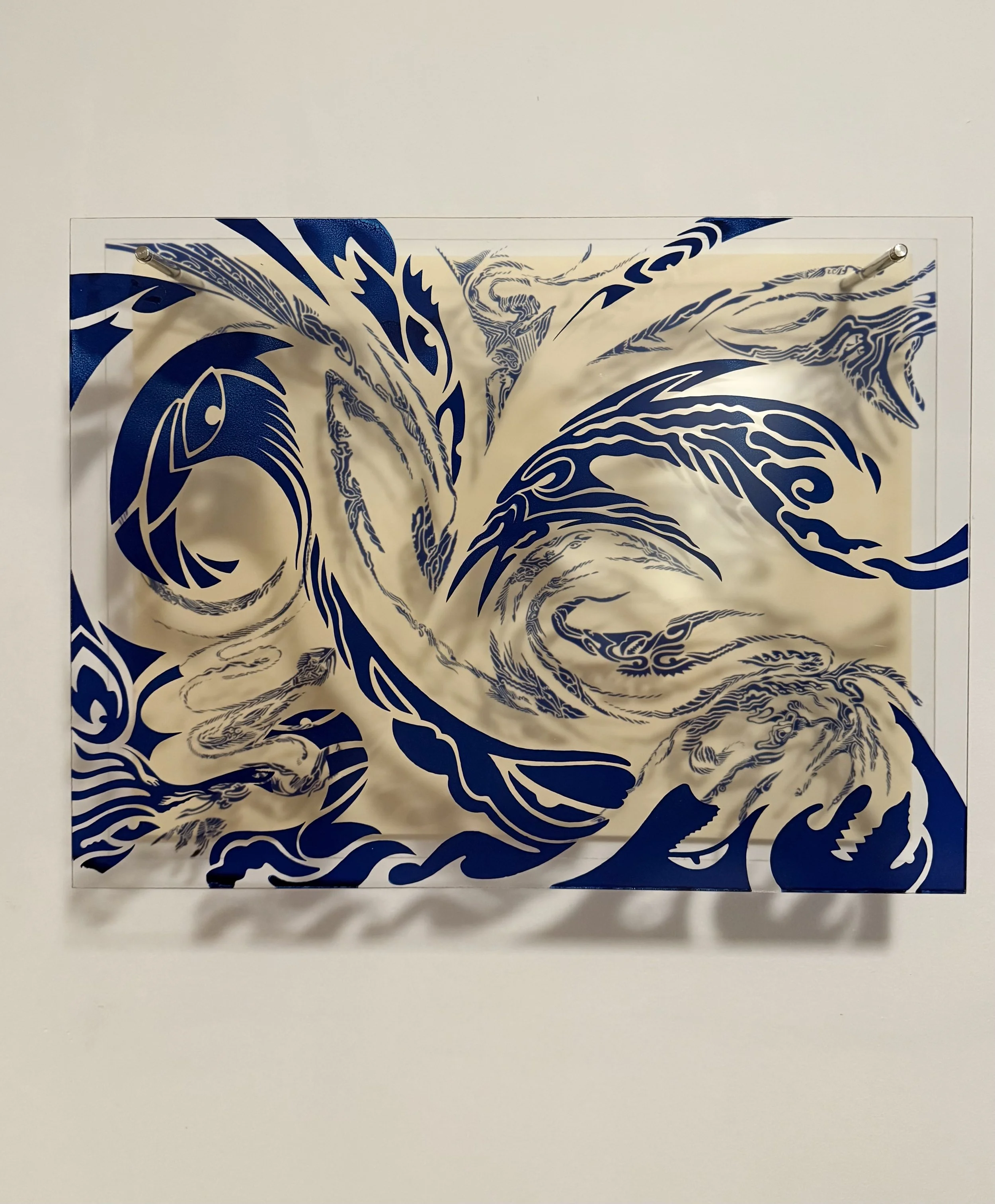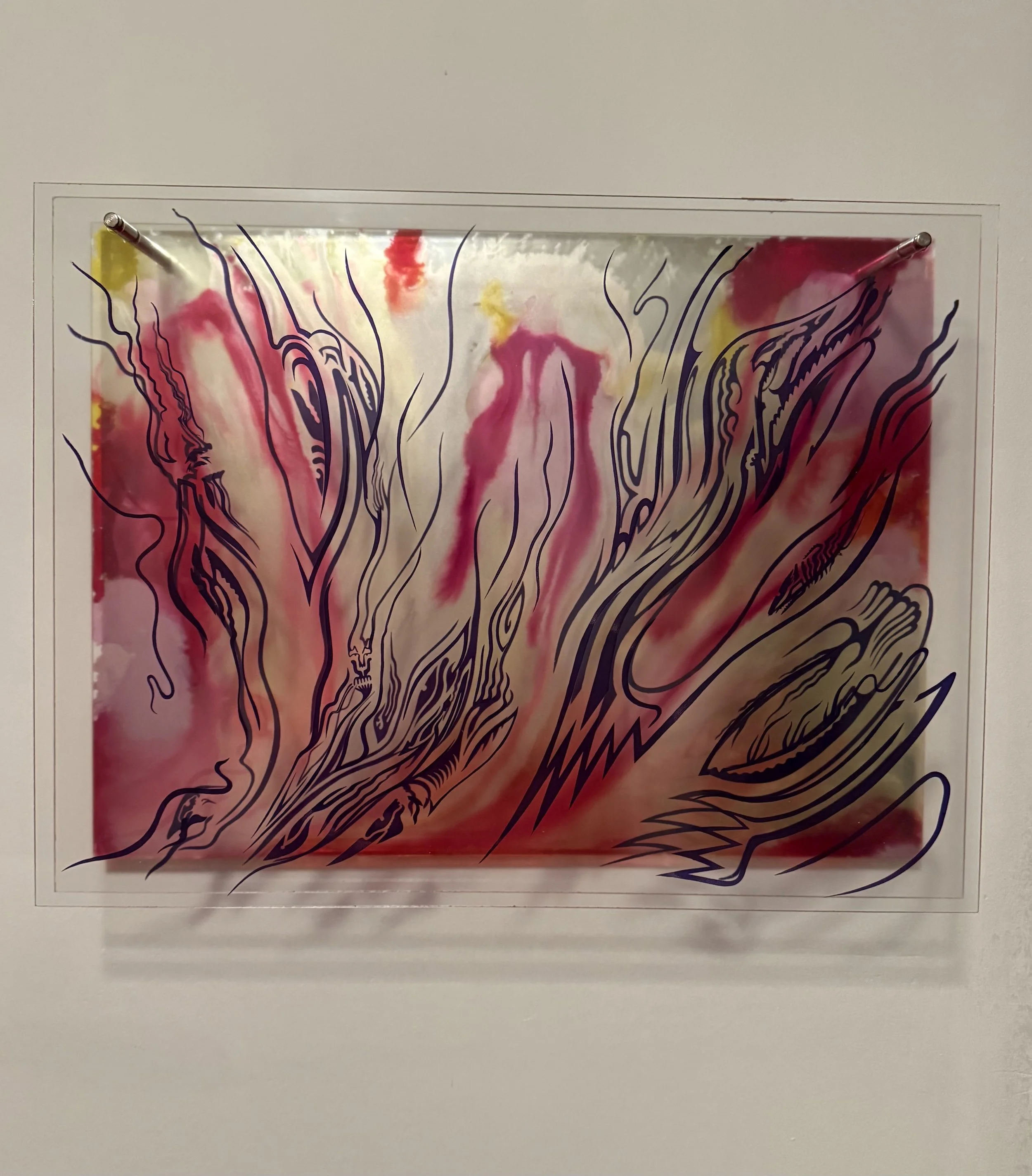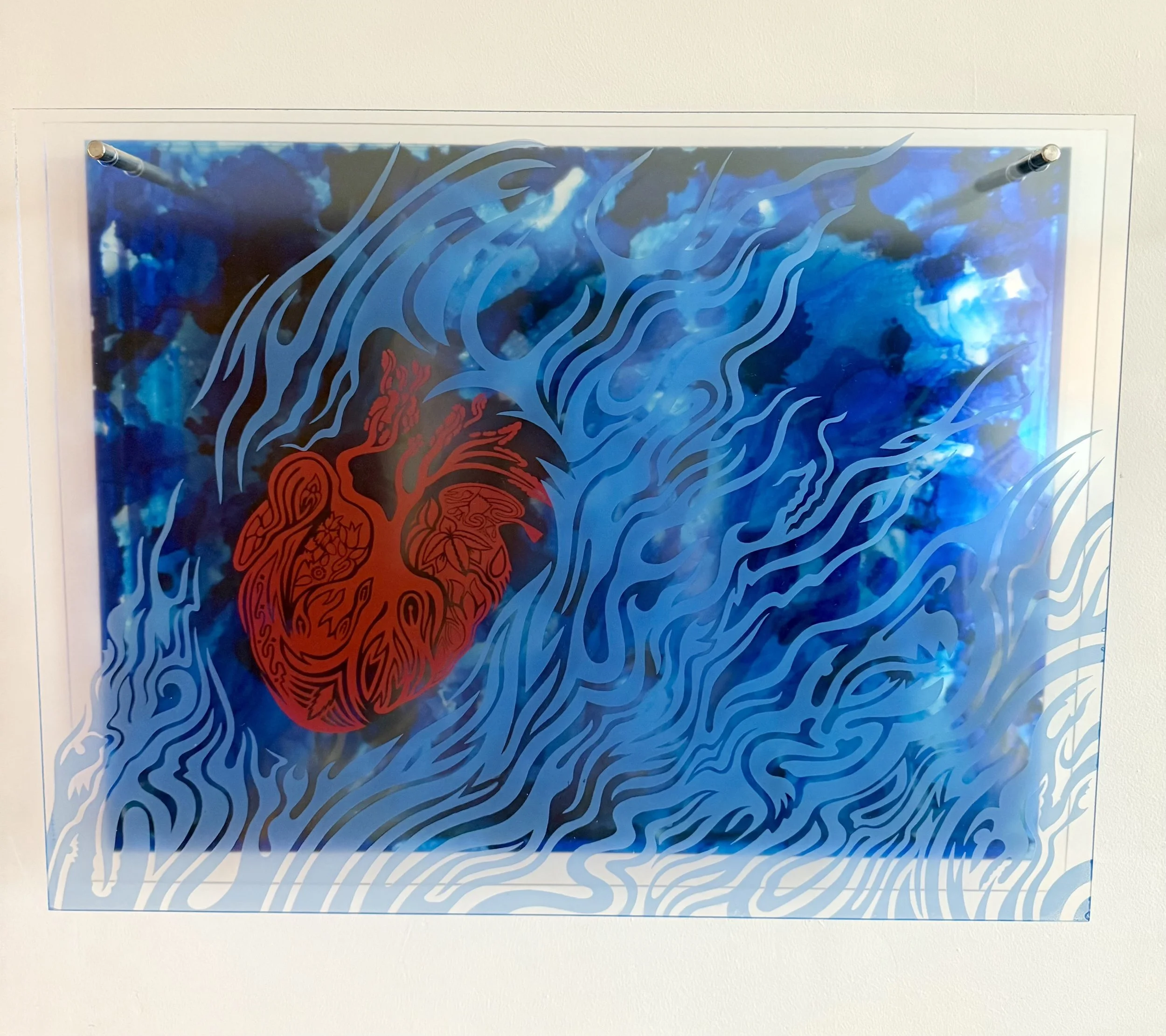 etched plexiglass and alcohol ink on plexiglass in artist’s chosen frame