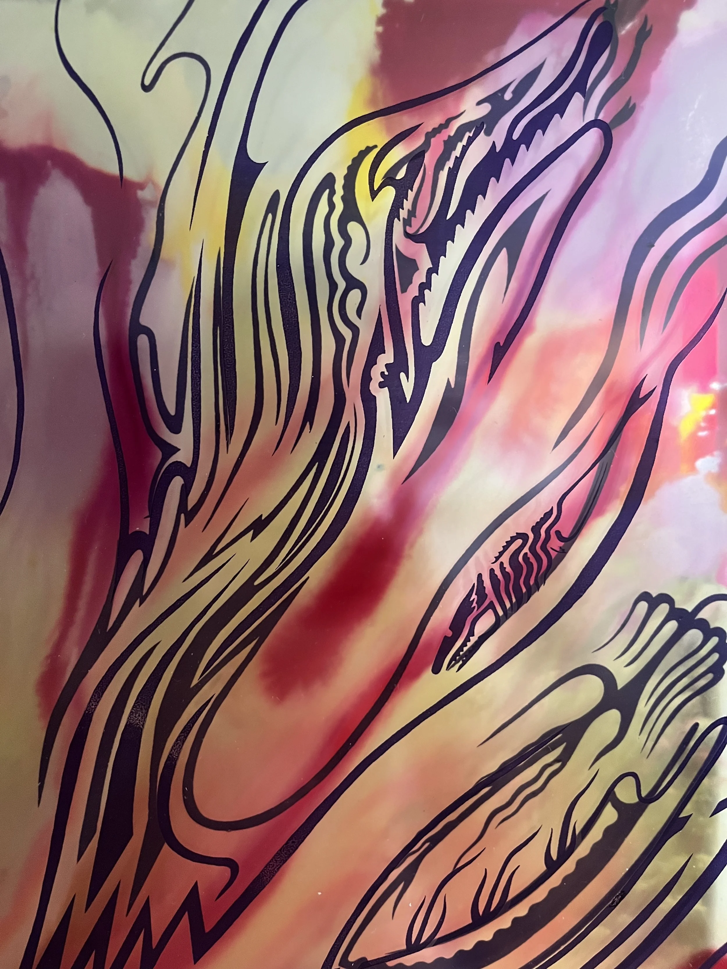 four panels of plexiglass, alcohol ink and silkscreen ink, hung from two metal rods